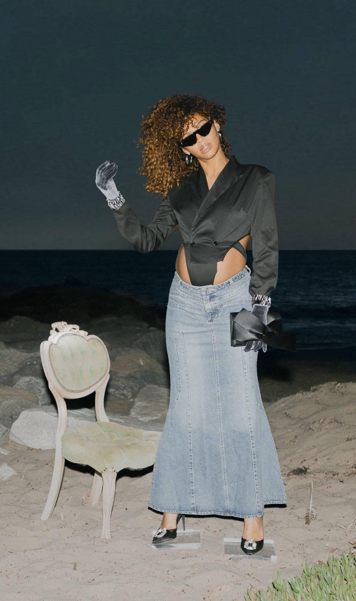 Mermaid-silhouette maxi skirt made from stretch denim, fitted at the hips and flared out toward the hem